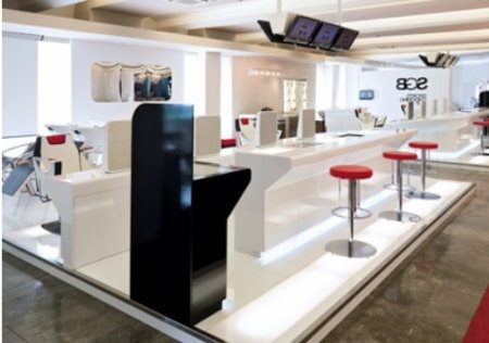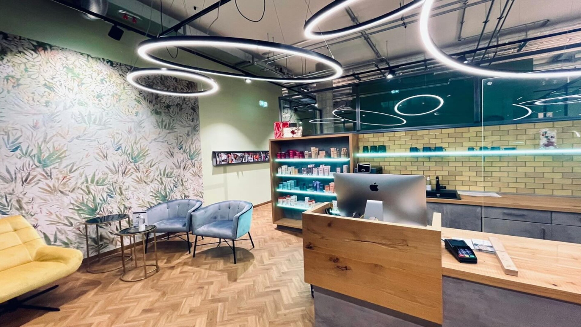 Klarheit und Wertigkeit im Mobiliar, bequeme Sitzmöbel und großzügige pflegeleichte Ablageflächen mit integrierten Handy- Aufladeflächen bestätigen den Service Gedanken des Salons. Willkommen in einer Welt aus ökologisch